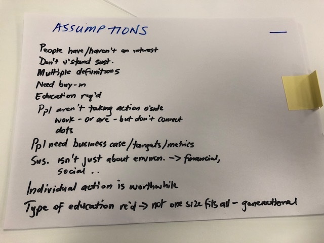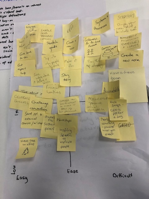 No training session would be complete without brainstorming. At my table we were looking at how to change the culture of an organisation so sustainability becomes part of everyone’s roles. We brainstormed solutions big and small, and mapped them against impact and effort.