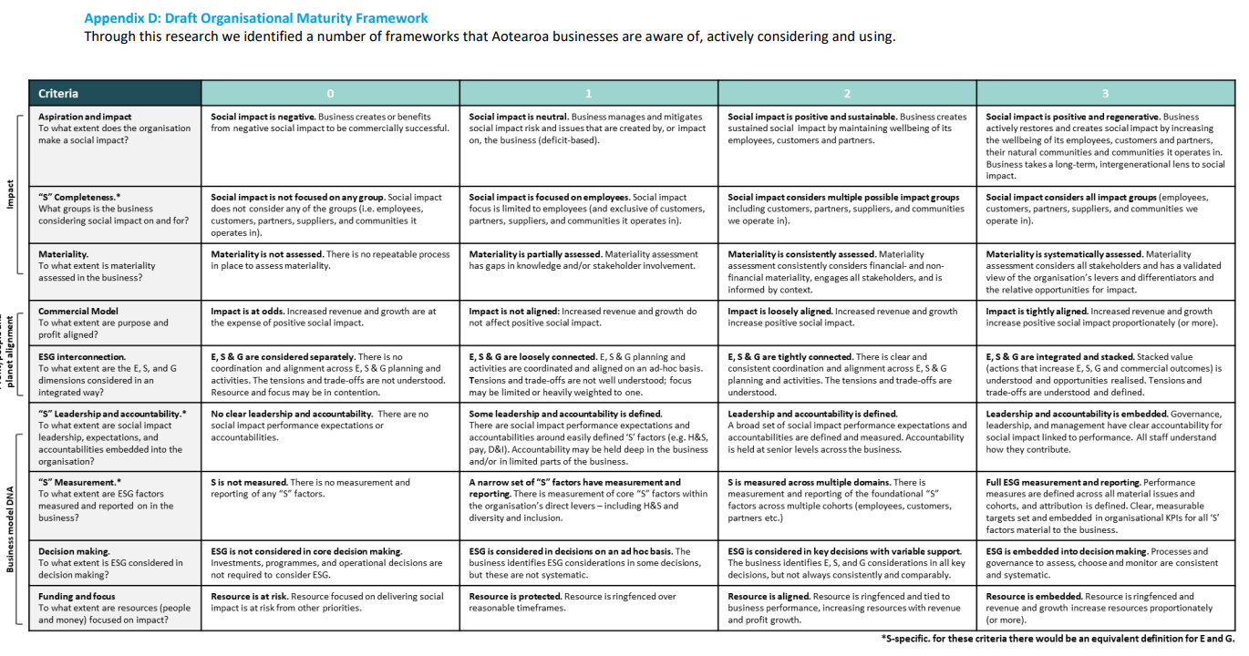 - outline practical tools and actions members can implement to improve positive social impact, including a maturity assessment matrix (see image below)